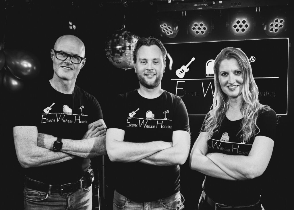 Eikens-Withaar-Honning is een professioneel, fris en energiek trio en klinkt als een voltallige band! EWH bestaat uit drie ervaren muzikanten: Eikens (WimJan): gitaar en zang Withaar (Tekke): toetsen, accordeon en zang Honning (Nelleke): zang. Wij zijn beroepsmuzikanten en spelen graag op uiteenlopende evenementen! Ook al zijn wij met z’n drieën, we klinken als een voltallige band. Virtuositeit, ervaring, power en professionaliteit zijn onze sterke punten.
